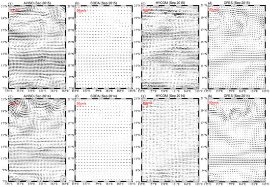 Figure 4. Monthly surface currents from Archiving, Validation, and Interpretation of Satellite Oceanographic (AVISO) (a,e), SODA (b,f), HYCOM (c,g), and OFES (d,h) in September 2015 and September 2014.