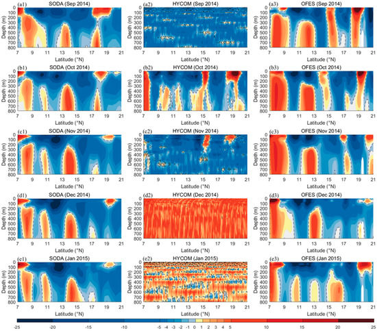 Figure 5. Monthly zonal velocities from SODA (a1e1), HYCOM (a2e2), and OFES (a3e3) at 160° E section during September 2014 to January 2015.