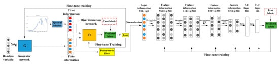 In recent years, deep learning has been developing rapidly as an emerging approach in the field of machine learning [,,], and it has been applied in the research of quantitative remote sensing []. An unsupervised deep learning model, the generative adversarial network (GAN) is composed of two networks: a generative network (G) and a discriminative network (D). The two networks can generate high-quality simulation data through a process in which they oppose each other [,]. A one-dimensional convolutional neural network (1D-CNN) is based on a one-dimensional planar convolution kernel to convolve the information receptive field. Because of its sparse expression and weight sharing, the number of parameters is greatly reduced, which improves network performance and reduces training cost []. Compared with existing methods, the OG-CNN model proposed in this paper only needs a small amount of real data to generate a large amount of high-quality simulation data, which greatly reduces experimental costs and improves the experimental efficiency. Unlike traditional inversion modeling methods, this method can fully learn the spectral information in the spectral feature interval, avoiding the loss of effective information with good spectral response and accurate separability.
