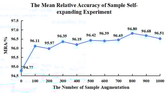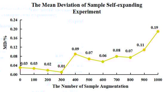 As shown in Table 6, as the number of self-expanding samples increases, the computational burden increases and the time of inversion experiment also increases. As shown in Figure 6, within a certain range, the inversion accuracy of the model as a whole increases with the number of self-expanding samples. As shown in Figure 6 and Figure 7, when the number of samples is 800, the R2 of the model reaches 0.975, and the inversion accuracy reaches a peak of 96.80%, which then shows a downward trend. Compared with the experimental results before the sample self-expanding operation, the inversion accuracy of the model has improved by 2.03%. As shown in Figure 8, the overall stability of the OG-CNN model decreases with increasing sample size. When the sample size is 1000, the MD of the inversion results reaches ±0.19%, and the model shows strong levels of jitter.