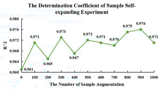 In the current stage of this research, most of the absolute thickness data of crude oil films were obtained under outdoor favorable conditions, and the amount of data obtained was limited. Moreover, the inversion of the absolute thickness of the oil film requires the support of a large amount of data. The OG-CNN model proposed in this paper can generate high-quality simulated crude oil film spectral feature data based on the GAN’s adversarial training process. Through the data self-expanding process of the model, it can enrich the diversity of the samples and enhance the generalization ability, thereby improving the inversion accuracy of the model. After fully considering the accuracy in the pre-experiment, the stability and the goodness of fit of the model, we varied the number of self-expanding samples to range from 0 to 1000 (for a total of 11 experimental groups) to explore the number of augmented samples with the best inversion results. The sample data self-expanding experiment inversion results are shown in Table 6.