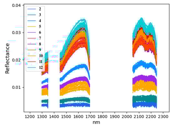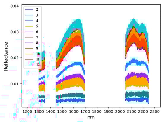 Because the spectral data in the channels 1350–1450 nm, 1800–2050 nm, and 2300–2500 nm are affected by the strong absorption of water vapor and spectrometer splice point offsets, abnormal fluctuations occurred; thus, we deleted the data. As shown in the figure, the remote sensing reflectance of the seawater is affected by the background of the fine sandy substrate and experiment device such as acrylic tubes and box. Hence, the spectral curve of the seawater shows abnormal jitter in the VNIR channels. Due to the thickness of the oil film in groups 2–4 is thin, the spectrum curve is significantly affected by the background of the sediment and experiment materials in the visible light channels. The oil film in groups 5–12 is thicker and has a stronger ability to absorb visible light, thus, the spectral curve is not easily affected by substrates. In addition, the spectral data of oil films of different thicknesses are poorly separable in the visible light channels and have good spectral separability in the NIR and SWIR channels. In these ranges, except for the fourth experimental group, which did not achieve a uniform thickness, the overall remote sensing reflectance of the oil film in the other experimental groups increased with increases in oil film thickness.