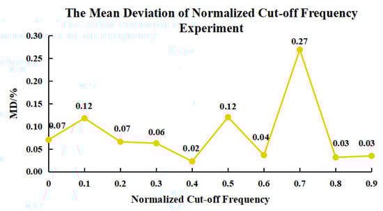 As shown in Table 7, when we set the normalized cut-off frequency of the Butterworth low-pass filter to 0.3, the inversion accuracy of the OG-CNN model reaches a peak of 98.12%, the R2 remains at 0.980, and the MD of the inversion results is only ±0.06%, showing better model stability. When the normalized cut-off frequency is set to 0.7, the MD of the model inversion results reaches ±0.27%, and the model jitter is severe. It can be seen from Figure 11 and Figure 12 that after a Butterworth filter is added to the OG-CNN model, the inversion results of the oil film thickness and R2 are substantially improved. In addition, when the normalized cut-off frequency is set to 0.3, the MD of the model’s inversion results is slightly improved compared with the model without the filter as shown in Figure 13, which effectively suppresses the jitter that may occur during the use of the model.