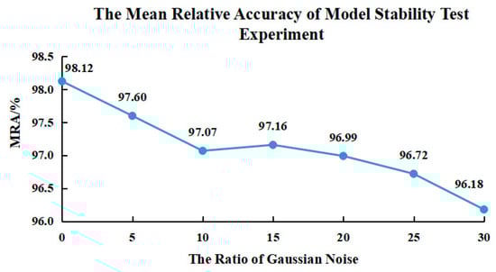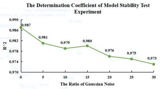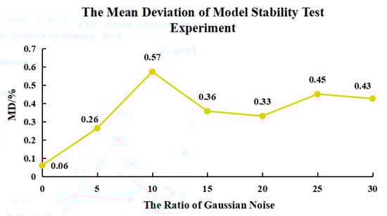 As shown in Figure 14 and Figure 15, as the proportion of Gaussian noise increases, the inversion accuracy of the OG-CNN model shows a downward trend overall. When the proportion of Gaussian noise reaches 30%, the inversion accuracy of the model decreases to 96.18% and R2 decreases to 0.973. In addition, as the proportion of noise increases, the overall jitter of the model increases, and the instability of the model also increases. As shown in Figure 16, when the proportion of Gaussian noise reaches 10%, the jitter of the model is the most severe, and the MD of the inversion results reaches ±0.57%, but the inversion accuracy of 97.07% is still maintained.