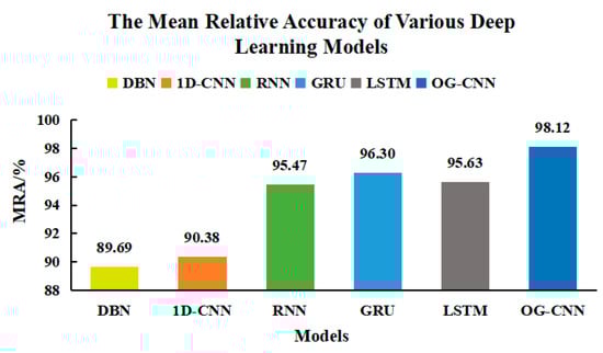 It can be seen from the Figure 17 and Figure 18 that the OG-CNN model’s inversion accuracy and goodness of fit for oil film thickness are higher than those of other types of deep learning models. Recurrent neural networks such as GRU also have good inversion results, while traditional 1D-CNN and DBN models perform poorly in the inversion experiment and have low inversion accuracy.