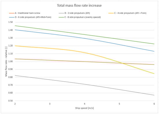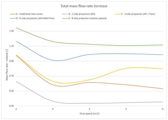 The Methods section describes that in order to compare the thrust efficiency, four different symmetrical layouts of ideal propulsors were proposed along the hull, with 2, 4, 6, and 8 propulsion units. As a fifth case, the classical two-propeller stern arrangement for reduced draft was also analyzed. A series of CFD simulations was performed with identical conditions and with the same total pressure-generated force on the propulsors. During the calculation, the mass flow values in front of the plane, at the working plane, and behind the plane of the propulsors were recorded, and subsequently, the results were evaluated using Rankine’s theory.