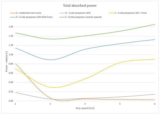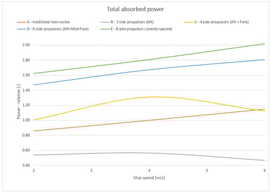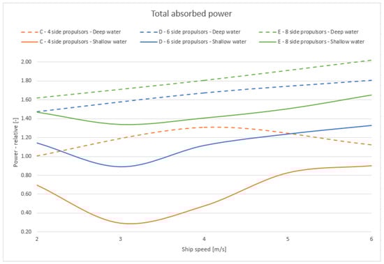 In the following comparative line graphs, the resulting total values are shown, where every curve represents a specific hull/propulsion layout. The absolute values of layout A in deep water at a mean speed of 4 m/s have been chosen as the reference unity values to calculate the relative values.