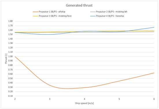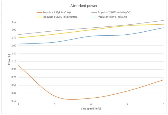The examples in Figure 12 and Figure 13 represent the resulting generated trust and absorbed power values for hull/propulsor layout E (8 propulsors) on a per-propulsor basis. For these two special graphs, the absolute values of the aftmost propulsor at speed 2 m/s in shallow water have been chosen as the reference unity values.