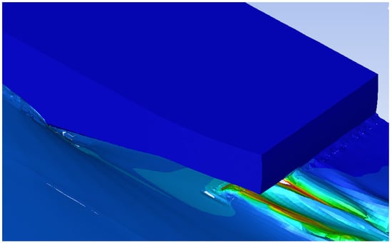 A visual check of the water flow field around the ship hull and the propulsors, the free surface of the water, and the wave pattern is possible in the graphical output generated by the CFD system (Figure 4). Some special variations in the values of the reported hydrodynamic quantities can be easier understood in this simple way (Figure 5).