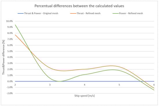 To determine the effect of mesh quality, a dependence study has been performed for case E in shallow water. For the new analyses, the CFD mesh of the entire computational domain has been refined by halving the average element sizes. With these several times larger amounts of elements, the interval of sailing speeds from 2 to 6 m/s has been analyzed and the results have been compared with the values obtained from the original coarser mesh. The result of this comparison is shown in Figure 17 as percentage difference of the new values from the reference values. The graph shows that in the operating range of the vessel, the maximum difference value is close to 2.5%, which is fully acceptable for comparison purposes.