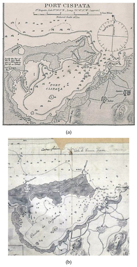 Cispatá bay. (a) Inset of the Kellett and Wood map [13] (1902 or later) from their 1849 map, which, in turn, was copied from Fidalgo’s 1795 map (detail in (b)).