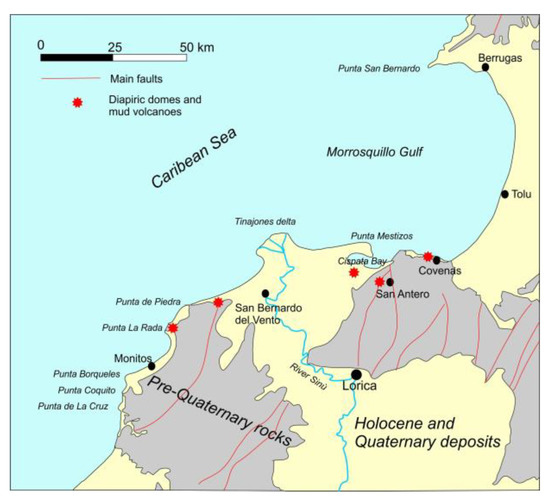The structure and morphology of the Sinú belt have also been deeply affected by mud diapiric intrusions that, near the Sinú delta, are evidenced by mud domes, mud fluxes and mud volcanoes found on the continental shelf and inland in the sectors of San Antero, Punta Mestizos, Punta de Piedra and Punta la Rada, among other places suffering strong subaerial and wave erosion [21,22,23].