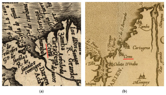 Rio Sinú’s mouth was drawn in 16th- and 17th-century small-scale maps that illustrate the seas and land of Caribe, sometimes enlarging the drawing to encompass the Pacific coast. Figure 5a shows the detail of Americae sive qvartae orbis partis nova et exactissima descriptio by Diego Gutiérrez (see [28]), which “includes more cities and more areas than previous maps” [29]. The 16th and 17th editions of Mercator and Ortelius atlases borrowed from this map, which, as with all small-scale 16th-century maps, can only give an approximate position of headlands, islands and river mouths. The map in Figure 5b is derived from Descriptionis Ptolemaicæ augmentum [30], the first printed atlas of the Americas, by Cornelius Wytfliet (1597). In both maps, the position of the Rio Sinú mouth is coherent with respect to that illustrated in original drawings of the following century by different authors.