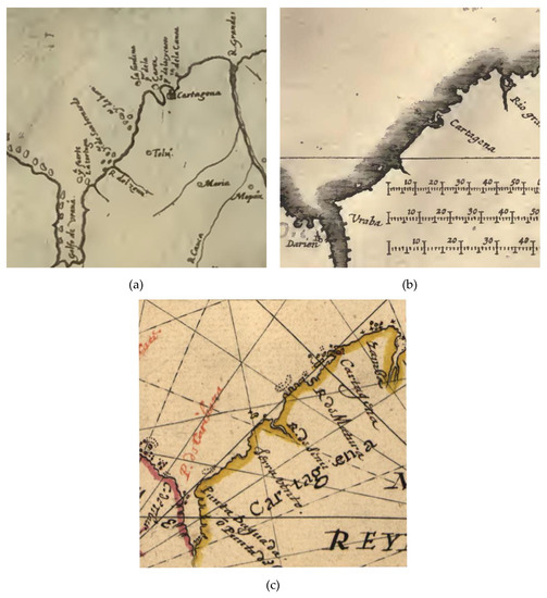 It is commonly believed that their accuracy increased with the improvement of geodetic science and of topographic instruments that were used to arrive at the geodetic and geometric maps of the late 18th century. This is partially true, but such a thought [3] could overshadow the reliability of pre-geodetic maps, produced by scale and linear measurements, that were obtained simply by walking and measuring the ground [4,5,6] and whose production grew in Europe in the 17th century and progressively became more reliable. This is due to the improvement of cartographic skills and thanks to larger-scale maps that are dedicated to small coastal sectors and show elements of territory in detail. This large-scale production became massive as strategic or commercial factors necessitated updated and accurate mapping: Cartagena de Las Indias (Colombia) is an example. The Spanish fleet, although dominant, was no longer alone in these seas: Dutch, English, Danish, French and, for the last centuries, American vessels were exploring South America, and many navigation reports included maps. European captains and pilots involved in the exploration of the Pacific also navigated the Atlantic coast, and the long course imposed some landings; though their interest was elsewhere, they collected or looted maps of these areas. Other maps were appropriated from lootings of harbors and ships of enemy fleets [7]. However, it was not necessary to go so far: Dutch editors of the local golden age of cartography are known to have acquired maps in the harbors of their country from foreign captains or sailors. The British Admiralty Catalogue of Charts, Plans, Views, and Sailing Directions, &c (an essential source for the nautical cartography of the last two centuries) shows that many non-English maps of South America were at the disposal of the Imperial fleet [8].