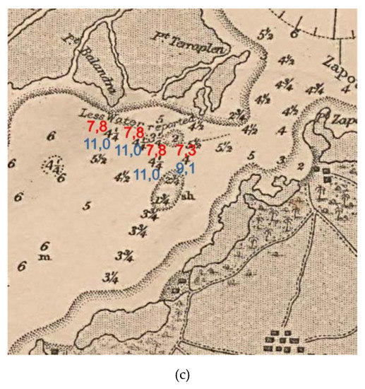 (a). Cispatà bay. Fidalgo Joaquin [53], 1795 (manuscript map, probably a preprinting sketch, Spanish). (b) Cispatá and the inner bay of Zapote. Fidalgo Joaquín [54] (undated, 1795 relief). (c) Comparison of soundings from ante 1732 Herrera y Sotomayor’s map [45] (or 1762 Jefferys [43]) and 1795 Fidalgo [54] soundings (in red). Converted to meters.