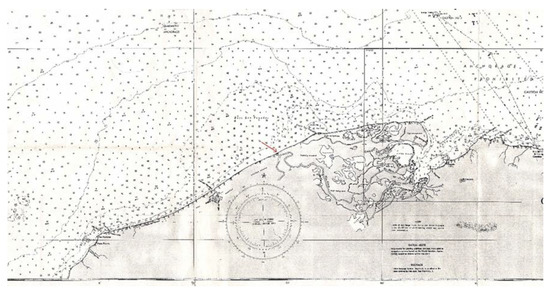 In Jeffereys’ (1762, but actually ante 1732) and Fidalgo’s (1795) maps, the shape of the bay and sounding positions are different (the former shows soundings next to the border of the bay that are neglected in the latter). Converting depth measurements to meters (Jeffereys gives them in English fathoms, in contrast to Herrera y Sotomayor and Fidalgo in brazas de pie de burgos; 1 fathom = 1.83 m; 1 braza = 1.67 m) and comparing them revealed evidence (Figure 8c) of fast and significant siltation of the inner bay in front of multiple Rio Sinú mouths from Sicaran to Punta Navíos. Here, Fidalgo drew, with the letter F, the entrance to the river mouth through a channel crossing a bar, where the water depth (in red) is approximately ½ braza (approximately 80 cm).