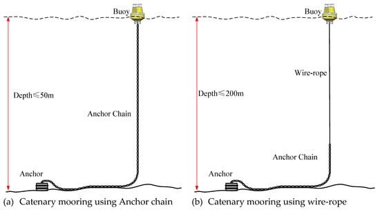 There are three typical mooring methods for buoys: chain-catenary mooring, semi-taut mooring, and inverse-catenary mooring [2]. The factors that determine the type of mooring include the depth of deployed waters, cost factors, the deployment strategy, and so on.