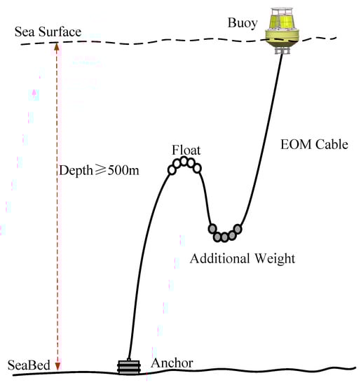 Satellite communication offers a low-bandwidth path for buoys, while optical fiber communication provides a high-bandwidth path from the seafloor to sea surface; for example, through an EOM cable. The cable utilized in the MOOS system is different from that in the seafloor observation network. The traditional EOM cables utilized in seafloor networks are armored EOM cable, which lie on the sea bottom statically. An armored EOM cable is not suitable for deep sea buoy mooring, however. The EOM cable has to be designed to have net buoyancy, in order for it to hang in the water for a long time. This kind of EOM cable requires high strength, excellent bending property, watertight performance, and wear resistance. Vectran fibers, nylon, and polyester are generally selected as the strength material. The properties of EOM cables with different strength materials have been compared in [11,12,13,14], especially the properties of the static and dynamic responses of mooring EOM cables.