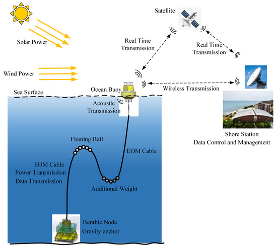 CUMAS (Cabled Underwater Module for Acquisition of Seismological data) was designed to extend the land surveillance network towards the wide marine sector of calderas, as shown in [6,7]. The system was deployed within 100 m of depth. The system is located at the Campi Flegrei caldera (southern Italy), one of the most hazardous and populated volcanic areas in the world. The scientific sensors include a seismometer, hydrophone, ocean current meter, and water thermometer. The MBARI Ocean Observatory System (MOOS) prototype, which is shown in [8,9,10], utilizes an EOM cable to deliver power from the buoy to the seafloor instruments, realize communication between the instruments and the buoy, and which can be deployed in the deep ocean (up to 4000 m depth). The surface buoy collects solar and wind energy, where horizontal axis wind turbines and solar panels are utilized for power collection. The wind turbine has a rotor diameter of 1.2 m with 300 W output in 12.5 m/s wind. The actual power is 60 W, which depends on the wind speed. The wind turbine and solar provide 48 V DC power bus for the battery. Through a DC–DC Converter, the system provides 12 V DC for the buoy equipment and 375 V DC for the ocean benthic instruments.