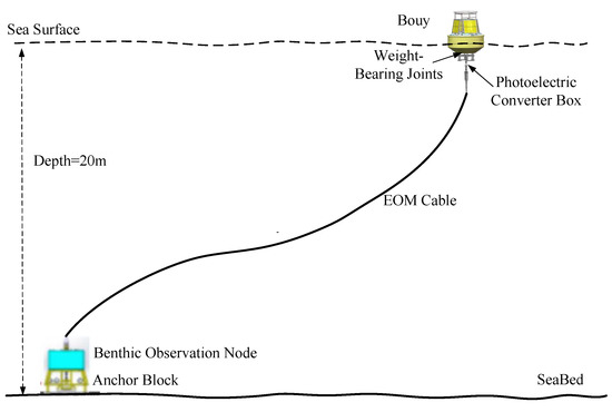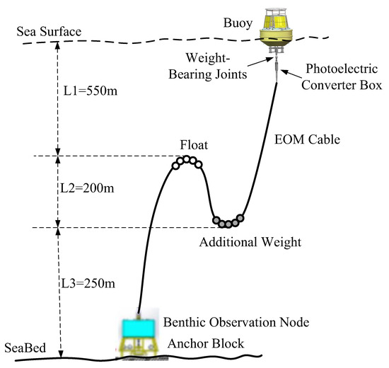 The buoy mooring system is mainly composed of the buoy, the mooring cable, and the anchor blocks. The anchor block is installed under the benthic node, supported through the acoustic release device. In the buoy-based Seabed Observation System, oceanographic instruments are used to obtain scientific data from the depths of the ocean. Hydrologic, meteorological, and water quality information are obtained from the seabed and surface nodes. If the system is mooring by a traditional anchor chain, using nylon or polyethylene material for the mooring, energy supply from the buoy to the benthic node cannot be achieved, nor can data be transmitted from the benthic node to the buoy. If an electro-optic-mechanical (EOM) cable is used for mooring, the collected seabed information can be transmitted to the sea surface by using the optical fiber, as well as realizing energy transmission from the buoy to seabed node.