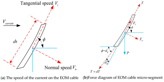 In this section, the hydrodynamic force of the cable caused by the ocean current is analyzed. For analysis of the hydrodynamic force, the mooring cable was divided into several micro-element segments. First, the force formulae of two adjacent micro-segments were obtained. Then, considering the current hydrodynamic force received by each micro-segment, the force relationship between adjacent micro-segments was derived and the iterative calculation algorithm of the hydrodynamic force on the EOM cable was deduced. Therefore, the tension of the EOM cable can be solved using the iterative calculation algorithm, selecting the two boundary conditions as the initial conditions at sea surface and seafloor.