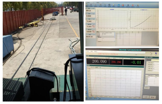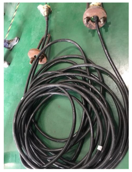 The EOM cable had sufficient strength and was verified by tensile test, in order to make sure that it could moor the buoy well. Figure 20 shows the tensile test experiments. The EOM cable was first tested with a rated safe working load of 7 tons and kept for about an hour, after which the EOM cable was tested with a breaking load of 20 tons and kept for about 10 min. The test results showed that the EOM cable could withstand the working load and Minimum breaking strength.