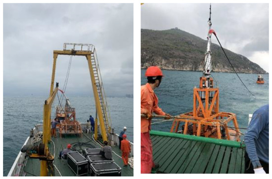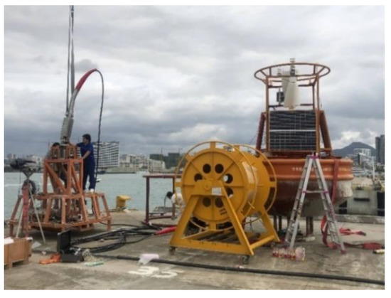 In this section, the deployment process of the system is discussed. The process of the inshore test is as follows: First, we installed the system at the wharf and tested the system to ensure it works properly, as shown in Figure 21. Second, we put the buoy into the water with a crane from the wharf and towed the buoy to the launch position, as shown in Figure 22. Finally, we utilized the winch to lift the benthic node to the seafloor. After deploying the benthic node to the seafloor, we released the lifting point to separate the lift wire rope from the system, as shown in Figure 23, and put the EOM cable into the water.