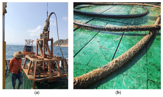 Recovery of the Benthic Node and EOM cable: (a) Benthic Node recovered on the ship deck; and (b) appearance of recovered EOM cable.