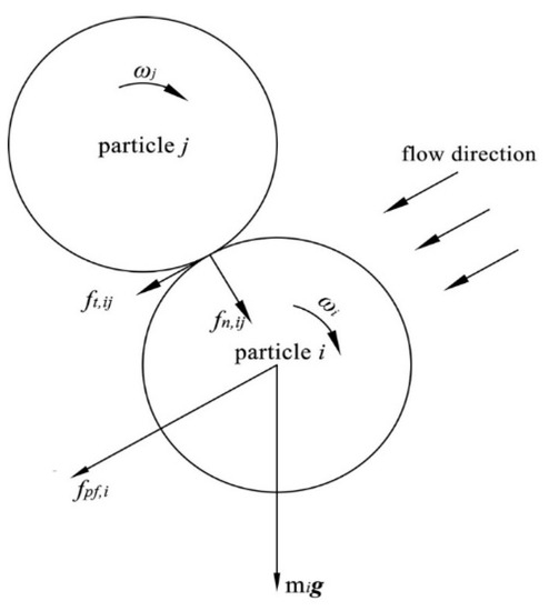 Here, mi is the particle mass. vi and ωi are the particle translational and rotational velocities. ki is the number of particles interacting with particle i. fn,ij is the normal contact force between particles i and j, ft,ij is the tangential contact force, ffp,i is the interaction force between the particle i and fluid, which includes pressure gradient force fpg,i and fluid drag force ffd,i. mig is the gravitational force. Ii is the moment of inertia, Mt,ij and Mr,ij are the tangential and rolling frictional torques acting on the particle i and j, respectively. Figure 3 shows the forces and torques of particles during the collision. The Hertz–Mindlin (no slip) model was adopted in this research. In the particle discrete element method, the Hertz contact theory is generally used to calculate the normal force generated by particle contact, while Mindlin–Deresiewicz contact theory was used to calculate the tangential force. The formula about the forces corresponding to the model are listed in Table 2 [16,35,36].