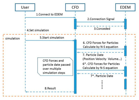 As mentioned in Section 1, the Euler–Lagrange method is applied to CFD-DEM coupled calculations. The essence is that the particles are calculated and tracked in the interacting flow field of the continuous phase and the discrete phase. A schematic diagram of coupling between Fluent and EDEM is shown in Figure 4. During the calculation, Fluent calculates the fluid firstly, after solving the Reynolds-averaged Navier–Stokes equations, it converges the flow field information to the EDEM. The DEM module in the EDEM calculates the particle forces under the flow field and obtains the particle trajectory. The results are then fed back to Fluent for further iterations until a convergent solution is obtained. In the Eulerian coupling method, considering the volume effect, particles and fluid do not overlap, and each occupies a unique physical space.
