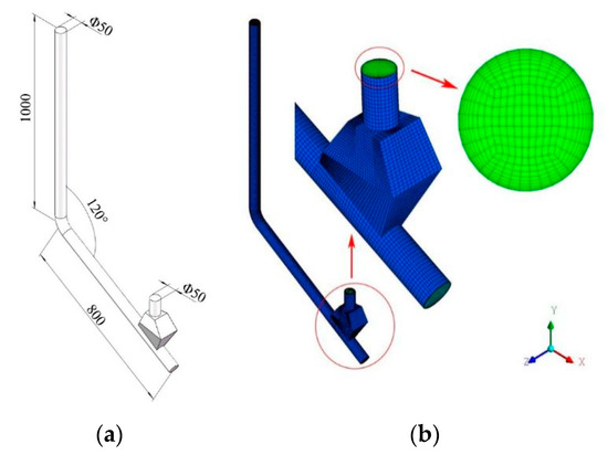 The Y-shaped elbow with 120° was designed in combination with the design requirements of deep-sea mining pipelines. The specific parameters are shown in Figure 5a. The fluid domain of the pipe was divided into a block-structured grid for making the calculation more accurate and easier to converge. The same trial simulations using grids with different qualities were calculated to select the optimum grid distribution, as shown in Table 3. Comparing the fluid velocity at the outlet, we found that the differences among the results were less than 0.02 m/s. The results tended to be a fixed value with the grid quantity increasing. Therefore, when the grid quantity reached 130,000, a satisfactory solution can be guaranteed. One of the meshes is shown in Figure 5. The non-dimensional distance between the first layer of grid nodes and the wall y+ considered in this work was about 70, which was consistent with the k-epsilon turbulence model.