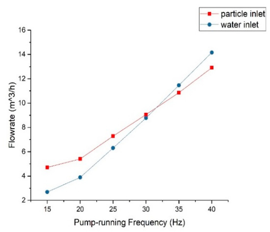 As shown in Figure 6, the relationship about the flow rate between particle inlet and outlet was carried out under different pump-running frequencies. The following parameters were selected to simulate the particle transport status of the Y-shaped elbow at low, medium and high velocities, shown in Table 4. vp and vf represent the velocities of particle inlet and water inlet converted from the flowrate under different pump running frequencies.