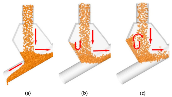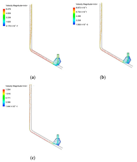 Most of the particles in the above simulation conditions moved along the pipe wall basically. We believe that this phenomenon is caused by the gravity of large particles, the conveying velocity is not large to provide enough force to counteract the gravity component of the particles perpendicular to the inclined pipe. Additional simulations were implemented as follows in Figure 8 to make a comparison with case 1–3. The flow rate of particle inlet was doubled and the water inlet was 1, 2 and 4 times that of case 3, respectively. With the increasing of conveying velocity, most of the particles no longer moved along the pipe wall. Meanwhile, particles entering the vertical pipe will diffuse to the pipe center more quickly. More particles were accumulated in the mixing chamber due to the impact of the high-speed water flow. Comparing the simulations under these three conditions, it can be found the particles in the inclined pipe become sparse as the flow rate of the water inlet increased. The main reason is that the impact of water on the particles increased as the water flow rate increased, more and more particles were pushed back into the mixing cavity; therefore, the flow rate of the water inlet cannot be too large, otherwise the efficiency of particle transportation will also be reduced. The particle motions will be discussed in detail later.