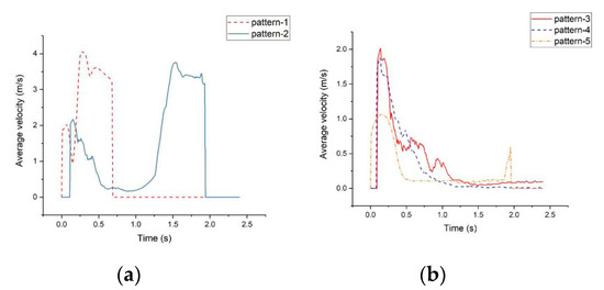 Comparing the post-simulation animations and the experiments under three cases, we found that the movement state of the particles underwent a progressive change, shown in Figure 9. The particle motions became more complicated with the lifting speed increases. The sampling data analysis was performed on the particle groups. The particles with the same motion mode (50 particles) were selected. The following five main particle flow patterns were obtained: smooth delivery, postponed delivery, detention, stacked and leaked, which were defined as particle 1–5, respectively. The curves of particle velocity versus time in different patterns are shown in Figure 10. Note that the velocity value “0” in the curve means that the particle is not in the calculation domain (not entering or having left). What is in common in Figure 10a is that particle 1 and 2 could be successfully transported. When particles were mixed with the fluid flow at the initial stage, the direction of particle flow changed. After a brief increase in velocity, it decayed due to collision with the inner wall of the pipe. It was found that the velocity of particle 1 underwent a secondary decay at the point where it entered the pipe elbow, after which it accelerated briefly and entered the vertical part of the Y-shaped elbow. As for particle 2, it took more time to entering the lifting pipe, because it was “trapped” in the mixing cavity due to the impact of fluid flow and other particles, but it finally entered the lifting pipe after an arc motion in the mixing cavity. The particle 1 and 2 mainly occurred in the cases of medium and high lifting velocities, while particle 3–5 mainly occurred in the cases of medium and low lifting velocities. As is shown in Figure 10b, the commonality among particle 3, 4 and 5 was that they could not make it to the outlet. Particle 3 was “trapped” in the mixing cavity and maintained a dynamic motion with a very small velocity, while particle 4 was stuck because of particle stacking in the pipe; therefore, the velocity of particle 4 was very close to zero. As for particle 5, it finally leaked out of the water inlet (the velocity peaked briefly at 1.8 s in the figure).