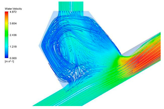 Figure 11 shows that the velocity distributions of fluid and particles in the Y-shaped elbows under case 3 were in the same state; that is, the distribution of the particles was substantially consistent with the high velocity region of the fluid in the pipe, except at the bend. The reason can be explained that the fluid near the intrados of the bend accelerated while near the extrados of the bend slowed down because of the effect of centrifugal force. As for particles, the gravity plays a major role in this situation. Most of particles move alone the pipe wall. When entering the bend, the particles continued to move along the pipe due to the centrifugal force. After the particles flowed into the vertical lifting pipe, they gradually diffused toward the pipe axis with the velocity increases. The fluid streamline in the mixing cavity was also made for a more detailed explanation in Figure 12. A vortex was formed due to the fluid interaction between particle and water inlets, which is why some of the particles will do an arc motion in the cavity.