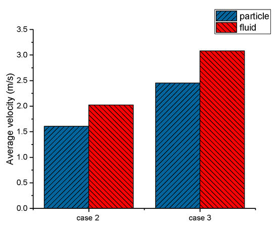 Additionally, average velocities of fluid and particles in the Y-shaped elbow were calculated, shown in Figure 13. The average velocities of fluid in case 2 and 3 were greater than that of particles. Analysis from the perspective of particle forces was performed. Large particles were mainly subjected to gravity, drag forces exerted by the fluid, and interaction forces with other particles in the fluid domain, particles keep sliding along the pipe for the fluid cannot provide enough lifting force to balance the gravity component of the particle parallel to the pipe wall. Consequently, the particle cannot fully accelerate; therefore, the fluid was faster than particles.