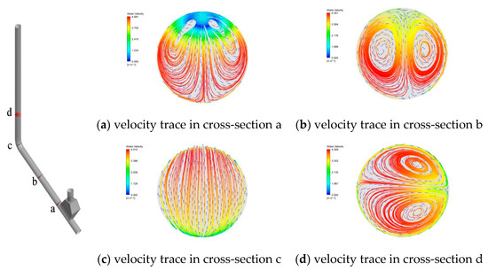 The secondary flow of fluid plays an important role in particle motion and elbow erosion [32,37,38]. Here, the secondary flow paths and vectors of four red-cross sectional planes of the 120° Y-shaped elbow in case 3 are observed in Figure 14. Due to the influence of fluid from the particle inlet, the flow direction of section a was towards the lower pipe wall, the fluid pushed the particles downward. Along the inclined pipe, the flow direction of section b was the same as section a and the secondary flow also played a part in the movement of particles moving along the wall currently. The difference is that the bigger vortex moved to the center of the pipe. At section c, the vortex disappeared and the vectors flow from the extrados towards intrados of the elbow influenced by the centrifugal force. At the vertical part of the pipe, the flow direction of section d changed back to the outside of the pipe wall. Still, particles that have just entered the vertical pipe were maintaining a state of moving along the wall while not diffusing instantly. On the one hand, they were mainly affected by the inertia, the influence by the secondary flow could not be ignored on the other hand. Based on the analysis and other papers, it could be inferred that large wear will occur on the extrados of the pipe, more attention will be paid on the effect of secondary flow and different working conditions on particle transport and pipeline wear in the future study.