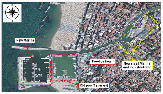 Cattolica municipality is a small touristic town of about 17,000 inhabitants located on the Adriatic coast. The economic activities are mainly related to seaside tourism and marine activities. The port of Cattolica develops along the mouth of the Tavollo stream and is protected by two quays. An important expansion of the port facilities was developed in 2008, building a new marina on the northern perimeter adjacent to that of the 1930s, that now is dedicated only to fisheries, and a new small marina (in the yellow area in Figure 1) surrounded by several services, including industrial and commercial activities, along the Tavollo stream.