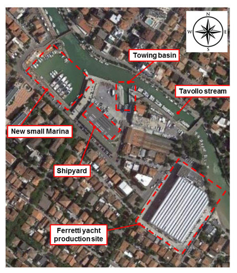 In particular, the small marina is located in a redeveloped area which includes a shipyard, one towing basin and one of the production sites of the Ferretti Group, dedicated to the realization of motor yachts between 20 and 30 m length (Figure 2). While the port inlet, the new marina and the old port suffer from sedimentation mainly caused by the sand transported by the sea, the area of the small marina and, more in general, upstream of the old port is affected by sedimentation of silt and clay transported by the Tavollo stream. The towing basin is used by the shipyard for the ordinary and seasonal maintenance operation to be done on private boats and fisheries, but it is also used by Ferretti to launch its yachts, which setting up is finalized in the nearby small marina. So, the accessibility to the towing basin is crucial for the port economy, since it impacts on recreational boating, fishing, and industrial activities. The pilot plant has been installed in the towing basin.