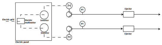 The pilot plant has been designed to feed with pressurized water up to two ejectors. The Piping and Instrumentation Diagram (P and ID) of the pilot plant is shown in Figure 4. Each ejector is fed by its own submersible pump. The water flowrate in each ejector feeding pipeline can be controlled by inverter. The water pressure at the pumps outlet is monitored by pressure transmitters (PT in Figure 4). Power consumption is measured by an electric multimeter installed between the grid and the inverters. The pumps operation can be scheduled on an hourly base, while the plant operation can be remotely checked and modified. Instruments readings have a frequency of about one second, but data are saved only every five minutes in a local database that can be remotely accessible to limit the size of the data storage.