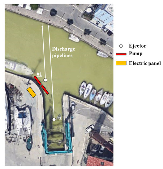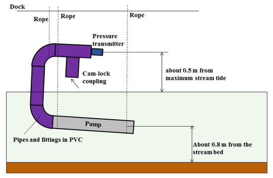 Figure 5 shows hot the pumps have been installed. Each pump is horizontal to avoid the contact between the water suction filter and the stream bed. Each pump is about 0.8 m over the stream bed, and it is fixed to the dock through three ropes. Both pumps are submersible pumps with cooling sleeves installed. At the pumps outlet some PVC connections are present. These connections come out from the water to allow the installation of the pressure transmitters. PVC connections have been sized to guarantee a distance of about 0.5 m of the pressure transmitters from the maximum tide. The PVC pipeline ends with a cam-lock connection to which the ejector water feeding pipeline is connected. Both ejector feeding and discharge pipelines have an inner diameter of 0.076 m. The feeding pipeline is made of PE and can work with a pressure up to 8 bar, while the discharge pipeline is made a transparent pipe made by PVC with a metallic spiral, and it is able to operate up to 4 bar.