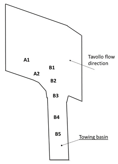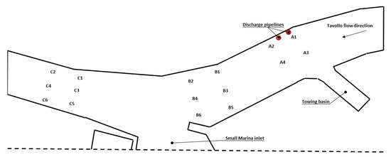 Two bathymetries maps have been designed by the University of Bologna for the Marina of Cattolica personnel, which was in charge for the streambed monitoring activities. The bathymetries maps are included in the Supplementary Materials. The first map is a general one, for the evaluation of the impact of discharge pipelines of the pilot plant on the streambed morphology at a wider scale, while the second map is focused only on the towing basin. Three different areas have been identified in the general map: an area A which is coincident with the discharge area of the pilot plant; an area B, which is 30 m downstream from the area A; and area C, which is more than 100 m downstream from the area A (and so undisturbed from the pilot plant operation). Figure 7 shows the position of the measuring points in the general map. Figure 8 shows the position of the measuring points in the towing basin area.