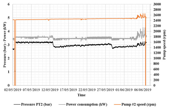Figure 10 shows the pressure variation at the pump n°2 outlet in the period between two external cleanings (2 May 2019 and 6 June 2019). In the same figure also power consumption and motor speed of the pump are included. Figure 10 shows how two different pressure drops can be highlighted in the period (approximatively on 13 May and on 28 May). Nevertheless, between the two pressure drops there is a pressure recovery from 2.8 bar to 3.1 bar. The pressure increasing can be read as a reduction of fouling in the external filter, or an increasing of ejector n°2 fouling, or a combination of both. The pilot plant control system generates several alarms, including high and low pressure alarms. So, an effective setting of low pressure alarm (i.e., 5–10% less of the pressure in “clean” conditions) can help plant operators to optimize pumps maintenance schedule. A pressure reduction can be read also as a decreasing of plant hydraulic resistance, which may be caused, for example, by a water loss at pumps outlet. However, this is not the case; in fact, both the pressure drops in Figure 10 are followed by a power consumption decrease, being the motor speed kept constant over the period. In case of water loss, the power consumption should be kept constant, or at least increase, depending on the water loss relevance.