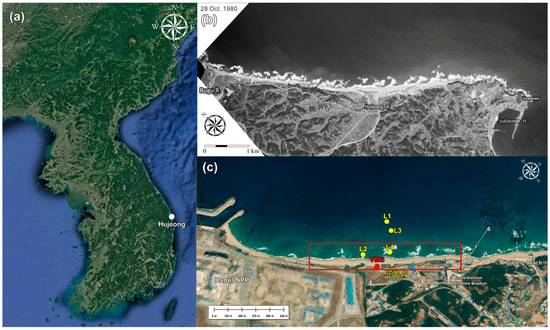 (a) Google map of Korean peninsula with location of Hujeong Beach, (b) aerial photo over Hujeong Beach in 1980 when the beach was in equilibrium before construction of Hanul Nuclear Power Plant (NPP), (c) locations of deployed instruments (L1 & L2 for Exp#1, L3 & L4 for Exp#2) on google map of Hujeong Beach. The red dot marks the location where the VMS was installed, and the red rectangle marks the coverage of the VMS. The map also shows that crescentic sandbars are actively developed in the nearshore areas of the beach.