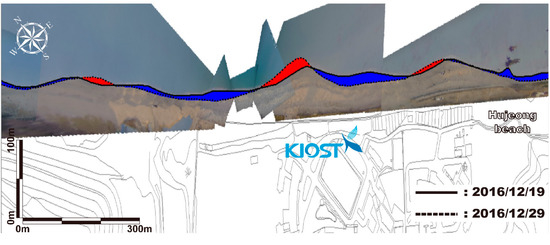 Comparison of shoreline positions in Hujeong Beach measured by VMS. Black solid line marks the shoreline measured on 19 December 2016 and black dashed marks the shoreline on 29 December 2016. The difference between these two lines is colored with red or blue as it denote the accretion or retreat area during the period respectively.