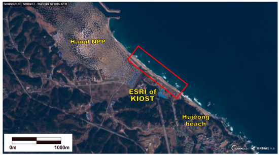 Image on Hujeong Beach measured by Sentinel-II on December 11, 2016, downloaded from Creodias platform (creodias.eu). The red rectangle marks the coverage of the VMS shown in Figure 2.