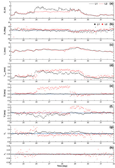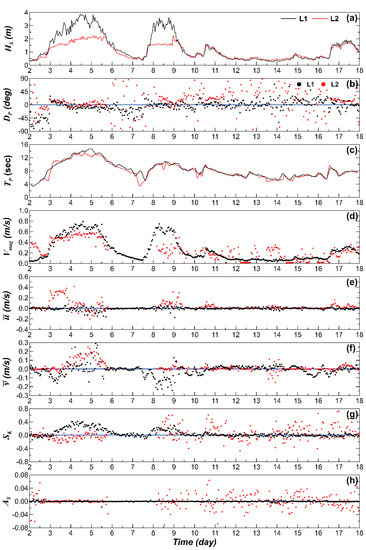 Once the storm period ended at t = ~6, the statistics of data in L2 was not available due to contamination until t = ~8 when the second storm waves occurred for shorter time period until t = ~9. The flow pattern was different from that in the first storm as in L2 was lower during this second storm period while in L1 was similar between them (Figure 4d). The direction of the cross-shore current was also different as in L2 directed onshore. The most significant difference can be found in as it remained positive not only in L2 but also in L1, which indicates that the wave shoaling might be dominant instead of breaking in both locations (Figure 4g). In addition, shows clear difference between L1 and L2 at t = 8–9 as the magnitude of increased in L2 as it was dispersed in wider range, compared to that in L2 where remained close to zero similarly to that observed in t = 3–5 (Figure 4h). Since the positive/negative sign of means that the waves were tilted backward/forward [27], the higher during the second storm indicates that the waves were deformed when they approached from L1 to L2. Another period examined in Figure 4d is t = 12–18 when the wave energy became low after the storms. in L2 shows more severe fluctuations compared to that in L1. It should be also noted that both and in L2 show higher dispersion around zero that led to their higher magnitude compared to those in L1 (Figure 4g,h). Specifically, in L2 tended to be positive, indicating that the waves became steeper as they approached the shore from L1. For , this tendency was not found as negative values were also observed, showing that the waves were tilted but not necessarily forward.
