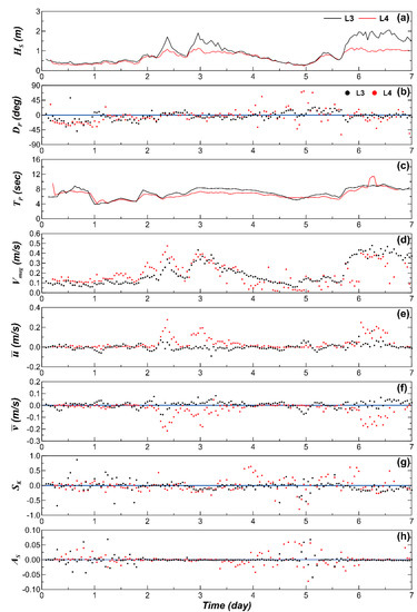 The characteristic pattern of is also clearly observed in Exp#2 as shown in Figure 6 in which the five hydrodynamic parameters are compared for T3 (December 21–28, 2018). In this time, a period of high waves when reached ~2 m was observed at t = 2–3 (Figure 6a). Correspondingly, increased to reach ~0.5 m/s in both L3 and L4. In case of currents, however, difference was found between L3 and L4 as strong cross-shore and longshore currents were observed at t = 2–3 in L4 while their magnitude was significantly smaller in L3. During the high wave period, the positive/negative in the outer/inner measurement location that was observed in Exp#1 was not detected, but the stronger scattering of in L4, the shallower location closer to the shore, was repeated. As for wave asymmetry, was significantly reduced during the high wave period in both L3 and L4 as ~ 0. However, it increased with strong dispersion around zero at other times, as also observed in Exp#1.