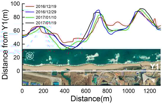 The image in Figure 9 was taken on 11 December 2016, nine days before the field experiment started on 20 December 2016. Although the Sentinel-II images are available for interval of 5–10 days, the sandbar data in Hujeong Beach were available on clear days only when the visible light could go through the water column to detect the seabed topography. For this reason, the next Sentinel-II image available in this site was measured on 31 December 2016, after the attacks of the two previous storms. The third Sentinel-II image available in the site was on 31 January 2017. Applying the same algorithm, the sandbar crest positions were extracted from the latter two images.