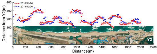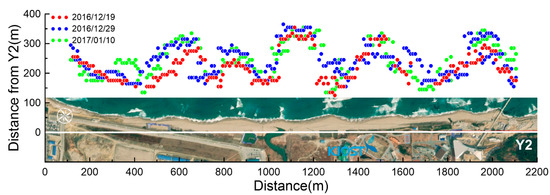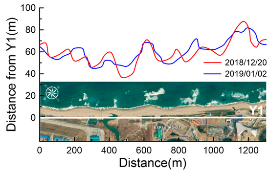 In Figure 2, the shoreline data measured from the VMS on 19 December 2016 and 29 December 2016 are compared. It shows that the shoreline was not straight along the beach, but had undulations as there were several locations where the shoreline was protruded to the sea. These protrusions were likely related to the nearshore sandbars that were observed at 3–5 m water depth [20]. In this study, the shoreline positions will be compared at different times to understand the beach process during the experimental period.